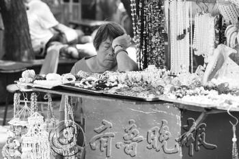 3日,在栈桥周边,一名商贩在摊位前打起了瞌睡。随着暑期结束、中秋将至,来青旅游的游客数量有所减少,沿海一线各景点、海水浴场都不再挤满游人。一些摊主开始为迎接国庆旅游养精蓄锐。 本报见习记者 杨广帅 摄影报道