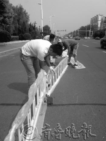 9月4日下午,施工人员在黄河八路中海公园南门处安装护栏。此次黄河八路护栏安装东起渤海九路,西至渤海十八路,全长4000余米。其中道路两侧安装机动车、非机动车安全隔离护栏共8000余米,道路中央安装安全隔离护栏4000余米,预计全部工程安装需要5天时间。