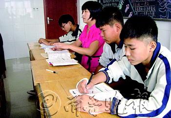 教师风采 孙村中学初三1班来了个大龄“女同学”,这位“女同学”没有穿校服,坐在教室最后排。虽然跟同学们一样坐在课桌前,她却可以不听课,还不时打量着周围同学的表现,表现不好的同学还会被请出教室谈话。 这位大龄“女同学”不是别人,正是班里的新任班主任毕耜淑。新学期一开始,毕耜淑又开始忙乎了,刚开学没几天有同学就给她起了个外号叫“四叔”。 见习记者 任丽媛 “滴水穿石是怎么形成的……”4日上午,孙村中学初三1班的化学课上,化学老师正在讲台上给大家讲课。刘一朝有点走神,坐在旁边的毕耜淑低声问:“滴水穿石是什么变化啊?”刘一朝回答:“化学变化。”“要好好听课,不要走神!”毕耜淑小声提醒。 毕耜淑是班上的班主任兼语文老师,但只要自己没课,她就留在教室里和同学们一起上课,成了班里的大龄“女同学”。但是,这位“女同学”有着诸多“特权”,虽然跟同学们一样坐在课桌前,但可以不穿校服、可以不听课,还时不时地打量着周围同学的表现,表现不好的同学课后会被她请出教室“谈话”。 “假期刚刚结束,很多孩子没有收回心,初三又这么重要,跟班就很有必要了。”毕耜淑说,与同学们一起上课,一方面能够监督同学,不搞小动作,不睡觉,不交头接耳;另外,还深入发现同学们存在的问题,及时纠正,多些与学生沟通的机会。 下午2点10分,上课铃响起,第一节是毕耜淑的语文课。学生们回顾了上节课所学诗歌,读到最后一句诗“数风流人物还看今朝”时,毕耜淑让同学们将“今朝”改成自己的名字,自信、嘹亮地喊出来。 虽然有老师的鼓励,但记者发现,这些来自农村的孩子在喊到自己名字时,声音就低下来了。毕耜淑鼓励同学们说:“我们要有自信,大家就是我们班的‘风流人物’,敢于喊出来,然后付诸行动。” 在毕耜淑再一次的鼓励下,终于,同学们第一次敢于将自己看做“风流人物”,鼓足了奋发学习的勇气,大声地喊了出来。 孙村中学是高新区孙村片区的唯一一所中学,周边53个村的学生在此读书。“这些村里的孩子比较羞涩,与城里的孩子比,不是很喜欢表现自己,相比之下缺少了一些自信。”毕耜淑说,她希望用各种方式来鼓励学生自信自强,包括在自己的课堂上。
