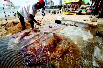 | 百余斤大海蜇现身浴场 |