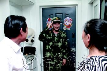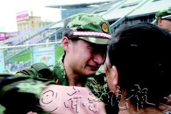 | 穿上军装给父母敬个礼。 |  | 就要离别,与母亲深情拥抱。