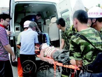 | 8日,消防人员正在现场紧急施救伤员。 本报记者 李大鹏 摄 |