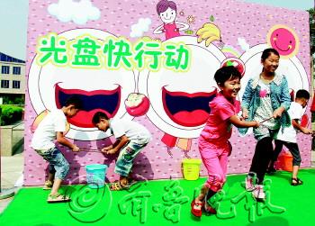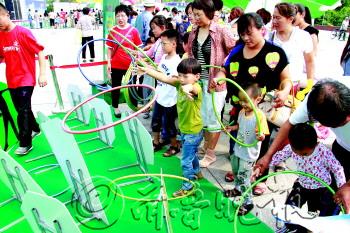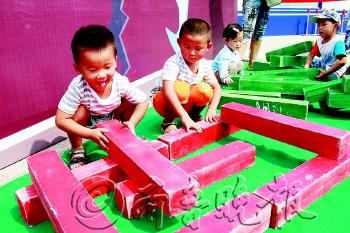 ■倍洁轻松去污渍,参赛的小朋友将沙包扔到桶内;环保家庭宣读环保倡议书。 |  | ■光盘行动,两人把小球运到小桶内。 |  | ■“汲汲”可危,用木条盖小楼。 |