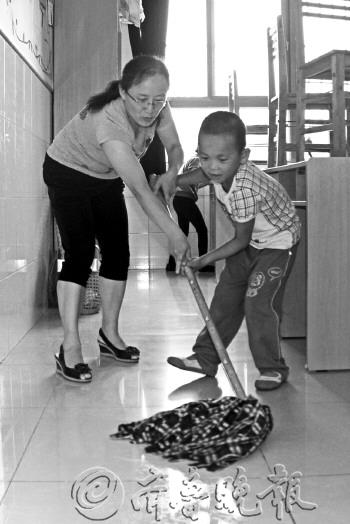 | 9日下午,已有16年教龄的赵老师手把手教刚入学的孩子打扫卫生。