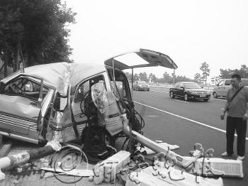 10日上午8点45分,在滨海路和泉韵南路交叉路口附近,一辆面包车由于在行驶过程中左侧车胎爆胎,车辆失去控制,司机在紧急停车过程中撞倒了路边的电线杆和垃圾桶。电线杆底部与车辆撞击,导致面包车中部变形,车内4人都有轻伤,所幸并无大碍。