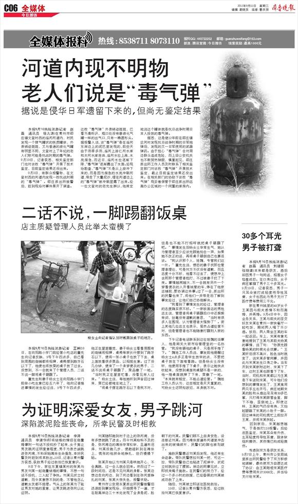 河道内现不明物老人们说是“毒气弹”