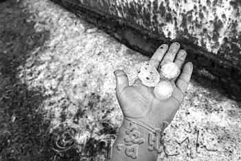 | 被冰雹毁掉的玉米地。 |  | 车窗玻璃被砸坏。 |  | 冰雹个头很大。 |
