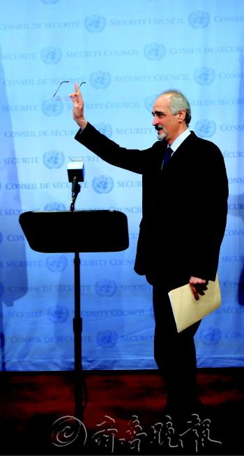 9月12日,叙利亚常驻联合国代表贾法里在纽约联合国总部对媒体讲话。当天叙利亚向联合国递交有关信件,启动加入《禁止化学武器公约》程序。         新华/美联