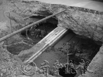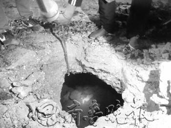 | ▲工作人员对暗坑进行修复。 |  | ◥东风街文化路口地下现长6米暗坑。 |