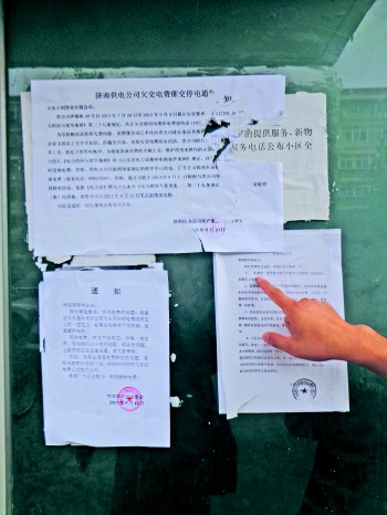 小区西门外墙壁上张贴的一份催交电费的通知书显示:小区累计拖欠电费117791.56元,截至9月10日,已累计产生940多元的违约金,而这类不同日期的催款通知书一面墙上就贴有好几张。
