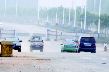 9月16日,在三八东路减河桥,两侧滨河道路的桥涵已经修建完工,施工人员正在进行收尾工作,但两侧的隔离护栏还未撤除,已有不少车辆绕过护栏,抢先通行。 本报记者 马志勇 摄