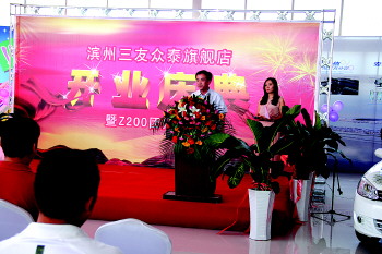 滨州三友汽车销售有限公司成立于今年5月份,现销售车型众泰Z100、Z200、Z200HB、M300。滨州三友努力追求汽车服务领域的最高境界,善待每一位顾客,理解每一位服务对象,预测甚至超越客户自身愿望,追求精益求精,保持领先的客户期望值和满意度。董事长赵洪奎在开业庆典上讲到:“三友众泰旗舰店开业后,我们将努力把众泰汽车的价值全方位带给滨州市场,我们将秉承谦和诚信、追求卓越、创新务实、回报社会的经营理念和方针。为扩大众泰汽车在滨州市场的销售占有而竭尽全力。”