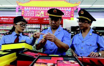16日,市工商局淄川分局工作人员,对辖区内某商场经营的礼盒装月饼进行现场检查。中秋节临近,该局加强对月饼市场的监管工作,重点检查食品批发市场、商场、超市、食品现场制售作坊等经营单位,着力整治月饼经营过程中的标识不规范、虚假宣传、掺假售假等违法行为。 本报通讯员 高德合 李杨 摄影报道