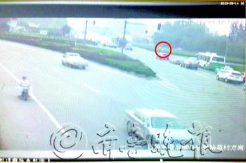 | 监控录像显示,小强正在沿着路向西前行。(红圈内行人为池女士儿子) |
