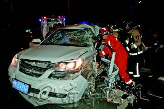 16日深夜11时许,高区吉林路、科技路路口,一辆油罐槽车和一辆越野车相撞。越野车变形严重,三人被困,满脸是血。高区消防吉林路中队队员徒手扳开变形的车门,成功救出三名被困者,三人都无生命危险。