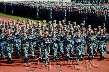 文/本报记者 李珍梅 片/本报记者 张晓鹏 18日8时15分,在青科大崂山校区,伴随着《中国人民解放军进行曲》在操场上空响起,身着迷彩服的3800名大一新生,站成二十几个方队接受军训检阅。 “冲……”一声口号响起,相对而站的两排男生手里握着枪,冲向对方;“卧倒……”口号响起,男生们迅速趴在操场上,向前匍匐。 巾帼不让须眉。一场由女生担任主角的军体拳表演,把“女汉子”的精神风貌表现得淋漓精致。“嘿!哈!”伴随着整齐有力的口号,英姿飒爽的女生们展示马步横打、穿喉弹踢、弓步冲拳等动作。 表演刺杀操时,近百名学生手持56式半自动步枪,这些步枪上都装有刺刀。“人生第一次拿真枪,很激动,我更能体会到保家卫国的使命感。”大一新生黄瀚枢说。