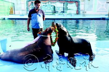 |  | 海狮“后羿”和海象“嫦娥”正在表演相亲节目。