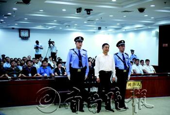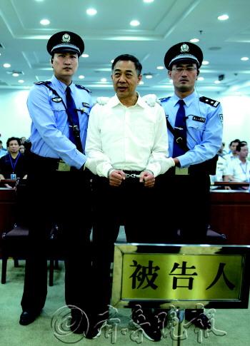 | 22日,薄熙来一审被判无期徒刑。这是法庭宣判现场。 新华社发 |  | 一审宣判后,法警给薄熙来戴上戒具。 新华社发 |