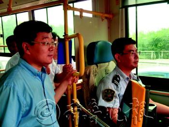 | 22日,城市无车日活动当天,潍坊市副市长夏芳晨(前)在人民广场乘坐一辆K16路新能源汽电混合公交车前往东苑公园站,用实际行动倡导绿色出行。 本报记者 张浩 摄 |  | 夏芳晨副市长专门询问了公交司机的福利待遇问题。