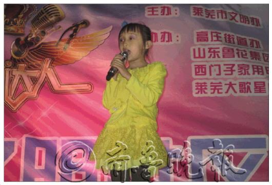 花絮: 鄂庄社区艺术团有个“活宝”爱反串 本报9月22日讯(见习记者 于鹏飞) 17日晚,本报文明社区行走进鄂庄,鄂庄社区艺术团女成员时玲反串了一首张宇的《用心良苦》,那充满磁性、低沉、厚重的嗓音征服了现场每一位观众,博得阵阵掌声。 记者了解到,时玲是村内的“反串之王”。时玲嗓音很独特,除了反串张宇的歌曲外,也酷爱演绎张雨生、齐秦等歌手的各类高音曲目。采访中,时玲给记者留下了深刻印象:开朗、大方、直爽,旁边人更是称她为“活宝”。跳广场舞、交谊舞样样都少不了她,凤凰传奇的动感舞曲信手拈来,1年365天天天不歇,甚至下雨、下雪从不间断。“虽然已经39岁了,但我总觉得像20出头,主要是心态阳光,咱打小就喜欢唱唱跳跳,也愿意跟村里老年人一起跳;有时候在家也不闲着,边放音乐边唱歌,多自在啊!”时玲感慨地说。 采访中,时玲表示当晚人山人海,特紧张,有些赶不上节奏,但重在参与。“孩子今年5岁,上幼儿园,每到晚上就拉着我的手去广场,广场舞慢慢跳得有模有样了。”时玲微笑地说。 甜美童音唱响《七色光》 本报9月22日讯(见习记者 张群) “K歌达人秀”的舞台上,七岁的蔺安心刚开口,现场就响起一片掌声。声音甜美,音调也很准,不少观众都如此评价蔺安心的歌声。 台下的蔺安心有些害羞,不爱开口讲话。她的妈妈李女士告诉记者,她三岁时,就喜欢跟着音乐哼唱,有一段时间还很喜欢凤凰传奇的歌。李女士觉得女儿有唱歌方面的天分,在她上幼儿园时,给她报了一个学习唱歌的兴趣班。班里教唱歌的老师说蔺安心的音色很好,希望她家里人能进一步培养。李女士说:“这次参加比赛就是兴趣班的老师帮忙报的名。” 此前,蔺安心参加过三四次歌唱比赛,也得过奖项。李女士称,她有意向让女儿继续在唱歌方面发展,一直在找专业的声乐老师,只要有合适的机会都会让女儿去试一下。