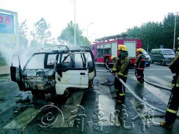 | 等红灯工夫,面包车冒浓烟 |