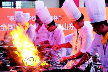 | 9月23日,福山区美食文化城,参加烹饪技能大赛的厨师正在切磋技艺。 特约摄影 孙悦 |