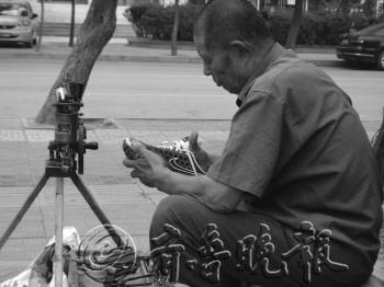 文/片 本报见习记者 张晓燕 程真 朱伟健 随着社会日益发展,一些老行当逐渐从我们视线中消失。对于出生于六七十年代的人来说,那些行业与他们的生活息息相关;对于80后来说,一些行业是他们童年的记忆。这些沉淀着历史印记和时代变迁的老行当,如今,都逐渐或已经退出了历史舞台,难觅踪迹。 胡师傅是无棣县堤头姚村的一位普通村民,今年71岁,自1997年至今已经从事修鞋行业16年了。“我早前从事装修行业,主要是贴地板砖的,年纪大了就干不了了,正好会这门手艺。”第一年修鞋的时候几乎没有什么生意,但是本着诚信经营,薄利多销的原则,他的生意渐渐好了起来,现在他每天都有活干。16年来,找胡师傅修鞋的几乎都是回头客。 胡师傅熟练地取出一块皮革样的东西,在机器上打磨干净,然后用专门的胶水粘紧,再在机器上打磨修整几下,一双皮鞋就修好了。胡师傅告诉记者,这些胶水是专用的,特别好用,保管穿上一年半载都不出问题。 其间,胡师傅的打磨机出了毛病,磨片在快速运转中突然飞走了,胡师傅只好重新剪裁一块,粘贴在打磨机上。修鞋时,胡师傅的神情很专注,动作很小心。“修鞋事虽小,但人人却离不开它,不起眼的行业同样发挥着重要的作用。”胡师傅说。