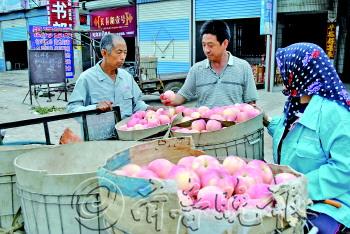 | 蛇窝泊镇上,收购商在看果农送来的苹果的质量。 (资料片) |