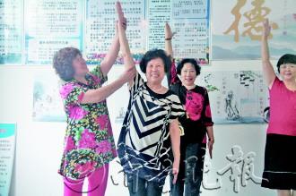 | ▲王天玲(左)在教居民正确的做操姿势。 见习记者 桑志朋 摄 |