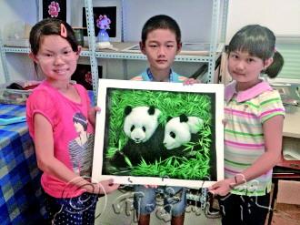 本报9月24日讯(记者 李孟霏) 一把丝绵、一把剪刀、一手精湛的技艺,靠着这些,丝绵画师傅可以制作出一幅幅精美的画作。21日下午,本报小记者及其家长来到高区海依达斯艺术馆,参观了丝绵画画廊,并现场观摩了老师们的创作过程。“原来丝绵也能做出这么美的画呀!”精细生动的表现手法,栩栩如生的动作姿态,让小记者们忍不住齐声感叹。 21日下午,天空飘起了雨滴,10名小记者和家长冒雨来到海依达斯艺术馆,参观有着“软浮雕”美誉的丝绵画。“妈妈,你看看,这个大熊猫毛茸茸的,真好看。”小记者方昱涵喊道。很多小记者听到喊声,纷纷聚过来了,大家仔细一看,画框里的大熊猫确实和平常的画不一样,就拿熊猫头部来说吧,眼眶、耳朵、鼻子、嘴巴……每一处除了颜色的渐变和晕染外,非常有层次感,逼真极了。小记者宋雨扬则站在一副名为《狼》的画作前,看了又看,她说以前只在电视里见过狼,此外再也没有见过这么逼真的。“你看它身上的每一个部位都是错落有致的,好像真的一样,我不敢在动物园里看,就在这多看几眼吧。” 如果说动物画作更能引起孩子们的兴趣来,那么人物肖像则更让家长们着迷。“你看看,这幅乔布斯的画像,简直就是他本人的感觉啊。”小记者毕嘉彤的家长说。此外,孙中山、钱学森的人物肖像画,也都让家长们驻足了很久,由于丝绵画特殊的工艺,丝绵纤维展现出了人物特有的肌理效果,生动逼真,让大家浮想联翩。 看到大家这么感兴趣,工作人员又带着孩子们和家长来到了制作车间,在车间内,大家看到了如此逼真的画作是如何诞生的。“哇,好多丝绵啊,五颜六色的真好看。”李声阳说,她以前经常见到丝绵,但是从来不知道用丝绵还能够画出画作来。丝丝缕缕的丝绵,在手工艺师傅的手中,一点点变为神奇的画儿。 “大家瞧瞧,丝绵画就是这样做出来的,比如这朵牡丹,先白描出雏形来,之后用不同颜色的丝绵打底,再一点点往上贴不同的丝绵,但是不是简单的贴,而是要经过揉、撵、捏等手艺,这样才能展现出层次感。”凤老师一边指着丝绵画,一边跟大家说到。而孩子们则认真的听着,一点点的感受着艺术的神奇和魅力。 一个小时的体验活动很快结束了,但是大家仍旧意犹未尽,李声阳和老师悄悄要了一把丝绵,准备回家试验一把,“我要做一个心型的东西,到时候送给妈妈。”