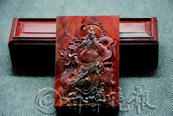 | 孙家欣雕刻的“关公戏龙”,此雕材料为老挝大红酸,厚度为1.5cm。 |