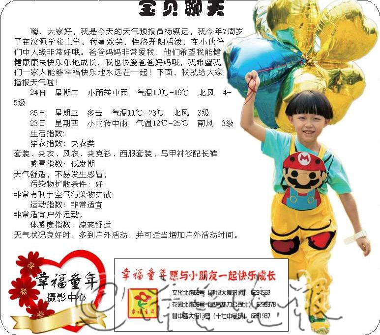 宝贝聊天 嗨,大家好,我是今天的天气预报员杨骐远,我今年7周岁了在汶源学校上学。我喜欢笑,性格开朗活泼,在小伙伴们中人缘非常好哦。爸爸妈妈非常爱我,他们希望我能健健康康快快乐乐地成长,我也很爱爸爸妈妈哦,我希望我们一家人能够幸福快乐地永远在一起!下面,我就给大家播报天气啦! 24日 星期二 小雨转中雨 气温10℃-19℃ 北风 4-5级 25日 星期三 多云 气温11℃-23℃ 北风 3级 23日 星期四 小雨转中雨 气温12℃-25℃ 南风 3级 生活指数: 穿衣指数:夹衣类 套装、夹衣、风衣、夹克衫、西服套装、马甲衬衫配长裤 感冒指数:低发期 天气舒适,不易发生感冒; 污染物扩散条件:好 非常有利于空气污染物扩散 运动指数:非常适宜 非常适宜户外运动; 体感度指数:凉爽舒适 天气状况良好时,多到户外活动,并可适当增加户外活动时间。