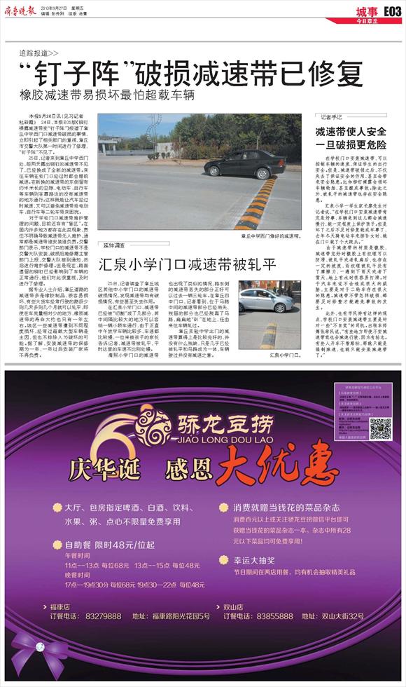 汇泉小学门口减速带被轧平