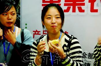 27日上午10点,在本报“栖霞苹果红齐鲁”公益活动展位前,吃苹果大赛吸引了众多市民关注。“我们能不能参加吃苹果大赛啊!”来自烟台大学的一群大学生来到展位前,期待取得胜利抱得一箱苹果归。 在第一组比赛中,有一对情侣搭档,于晓深和黄月佳。随着计时开始,5人开始争分夺秒地朝苹果咬去,虽是女生,这个时候也得放下淑女架子,毕竟时间不等人啊!最终来自烟台大学的学生韩程君第一个吃完苹果,获得冠军。领到满满一箱的贴字苹果,韩程君兴奋地笑了。情侣于晓深和黄月佳虽没有胜出,不过他们一起分享了苹果的甜美。 要说取胜的关键,韩程君说她是地地道道的栖霞人,家里种了不少苹果树,所以练就了吃苹果的一套硬功夫,取得胜利也在意料之中。 本报记者 王永军