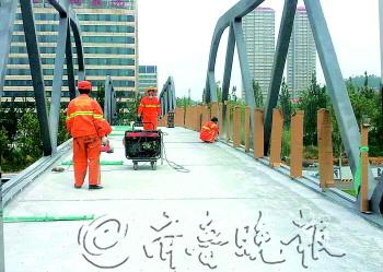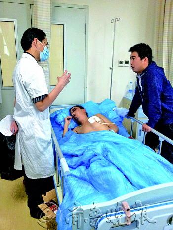 | 奥体中路正在施工的过街天桥今年10月就能投入使用。 |  | 事故中重伤的朱成祥躺在病床上呻吟不止。