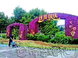 | 人民广场上的园林景观装饰上了“祥云”和“欢度国庆”。