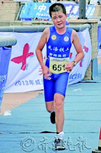 28日上午,在铁三赛男子半程20至29岁组的选手中,经组委会特批参赛的13岁张翰霖格外引人注目,稚气未脱的他从所有选手中脱颖而出,并以微弱差距夺得该组别的亚军。 13岁的张翰霖来自吉林长春,已经是第二次来威海参加铁人三项赛。25日,张翰霖一家三口从大连坐船来到威海,不管是熟悉赛道还是今天的比赛,爸爸张霄宇一直在儿子身边。 因为张翰霖的年纪太小,今年参加比赛属于组委会特批。不过他人小力量大,游泳和自行车是他的强势。在跑步项目中因为人矮腿短,最终以落后冠军10米左右的距离夺取亚军。 赛后,在休息室里,冠军于子群和张翰霖一起接受医疗队的放松按摩。28岁的于子群笑谈自己都快累瘫了,“第二名跟得太紧了,不拼命甩不开。果然是长江后浪推前浪,一浪更比一浪强啊,后生可畏。” 张翰霖说,自己回到长春后要进行特训,将重点加强对跑步的训练,2014年还会来威海参加锦标赛,希望到时候可以夺得冠军。