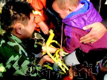 9月28日上午,单县一男子骑电动车带3岁的儿子外出,顽皮的孩子不慎将左脚伸进了电车后轮。这位父亲停车后多次试图将孩子被卡的左脚取出,但都未成功,而孩子因害怕和疼痛不断动弹,导致左脚被卡得越来越紧,脚背和脚踝处因不断摩擦已露出血迹。单县北园消防中队接到报警后迅速赶到现场,仔细观察,发现无法用工具施救,便考虑将车胎气放掉。随着气体放出,车胎一点点扁掉,孩子被卡左脚终于取出。