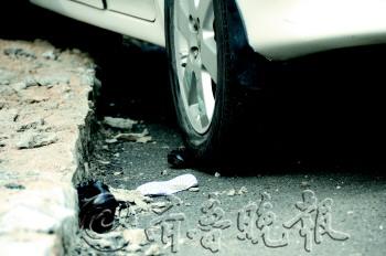 8日,鲁大校园里撞伤学生的肇事车轮胎下,还压着一位学生的鞋子。 本报记者 韩逸 摄