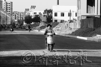 8日,胜利街修建工程接近尾声,市民可在平整的石子路面上骑车经过,现场停靠着铺设沥青的车辆。据了解,9日将开始铺设沥青,约两天后完工。 本报记者 王小会 摄