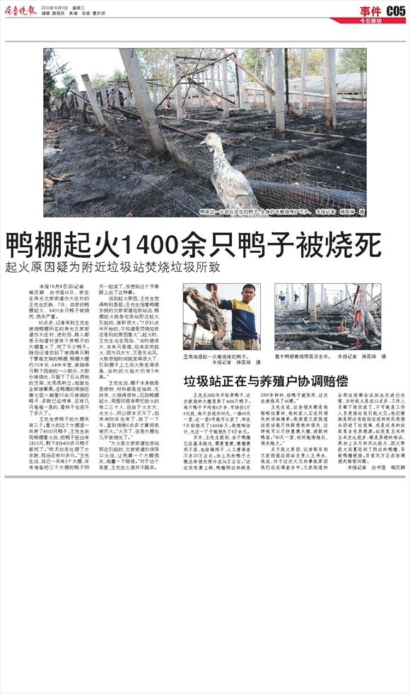 鸭棚起火1400余只鸭子被烧死