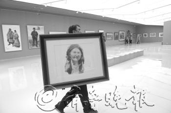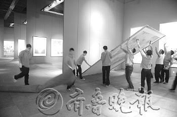 | 10日,全国优秀美术作品展开幕在即,工作人员在山东美术馆搬着蒋智南的作品准备悬挂。 本报记者 戴伟 摄 |  | 工作人员悬挂一楼展厅里最后一幅“巨画”。 本报记者 戴伟 摄 |