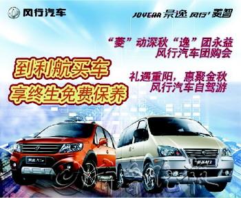 即日起,在济南利航购车都会享受终生免费保养。 10月13日,济南利航开展“礼遇重阳,惠聚金秋——风行汽车自驾游”活动;10月19日,举行“菱”动深秋,“逸”团永益-风行汽车团购会,届时会有丰厚的奖品和精彩的节目,咨询电话:0531-85609933。