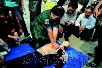 10日是“白金十分钟——全国自救互救活动日”,相关部门机构在临山公园举行了演示活动,向市民传授自救互救技术。据了解,紧急伤病发生的十分钟内是急救处置的关键时期,也被称为“白金十分钟”,由于专业救助人员很难在此时出现,所以普通人积极学习自救互救技术十分重要。图为一名医疗工作者在向市民教授心肺复苏技术。 本报记者 袁鹏 摄影报道