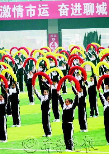 | 聊城市第二届运动会开幕式现场。 |  | 火炬传递。 |  | 国旗入场。 |  | 运动员代表入场。 |  | 观众席上,市民用相机记录下这次体育盛会。 |  | 800名中学生展示花环健身操。 |