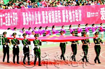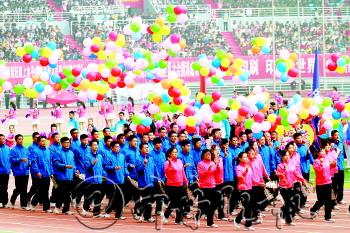 聊城市第二届运动会开幕式10月10日上午在市体育场举行。 10日早上7点多,可容纳三万名观众的市体育场座无虚席。9点,800名习武少年挟天地之豪气,奔跑到体育场内的草坪上,刀棍、拳剑,一招一式、闪打腾挪,演绎出了美丽聊城的武之魂。 随后,由中老年爱好者组成的800人展示团队,用太极拳、健身气功等不同的表现形式释放风采;聊城市第三中学的800名高中生展示队列操;来自市直机关11个部门和企事业单位的干部、职工、学生展示了第九套广播体操;800名文轩中学的学生挥舞着花环,展示花环健身操。 中华人民共和国国旗和聊城市第二届运动会会旗入场后,东昌府区、临清市、莘县、冠县等86支运动员代表对开始入场,升国旗、奏国歌,中共聊城市委副书记、市长王忠林致开幕词,山东省体育总会专职副主席徐大义致贺词,中共聊城市委书记、市人大常委会主任林峰海宣布聊城市第二届运动会开幕,升聊城市第二届运动会会旗、奏会歌,运动员代表和裁判员代表宣誓结束后,火炬入场,由张学信、吴育男、王洪岩等市民火炬手代表进行火炬传递,最后由聊城一中的学生代表周围子和周连振共同点燃主火炬。 主火炬点燃的同时,健身腰鼓、健身球、健身扇子舞、体育舞蹈、铁骑摩托、自行车骑行、轮滑表演等在场内一起表演,八名演唱者一起唱起会歌《放飞梦想》,整个开幕式结束。 市第二届运动会以“激情市运、奋进聊城”为主题,有些比赛项目先期举行,运动会共设10个大项,186个小项,金牌291枚。参加本届运动会的共有来自各县(市)区、市直各部门的86个代表团、4900名运动员参加。