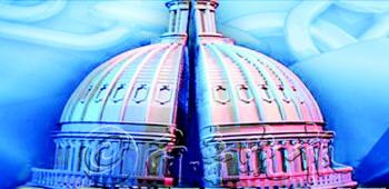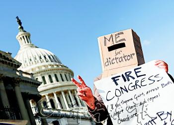 | ◥被撕裂的美国国会大厦。(模拟图) |  | 10月2日,一名示威者在华盛顿要求“解雇”国会。 |