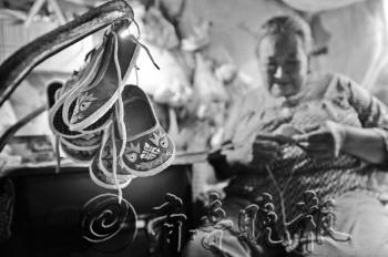 烟台金沟寨小区有这样一位老人,每逢晴天便弯着腰,推着辆破旧婴儿车卖虎头鞋。这些漂亮的鞋子只有巴掌大小,上面绣着精美的图案,从鞋面到鞋底都是老太太一针一线缝制的。 老人名叫孙景繁,老家沂水,今年77岁,现在租住在烟台金沟寨小区一个小房子里。老人的三个孩子都在烟台打拼,如今四世同堂。孩子们挺孝顺,可她却割舍不下做鞋的手艺。这个手艺代代相传,从母亲传到她手上,又传给她的女儿,在异乡的她仍希望这个手艺能传承下去。 现在做一双虎头鞋要花老人半个月时间,而她年轻时,两天就能做一双。虽然速度慢了,但针脚仍然细密、均匀。老人推着车一上街,漂亮的虎头鞋便能迅速引起围观,一些年轻妈妈还专门来预订。 本报记者 曲彦霖