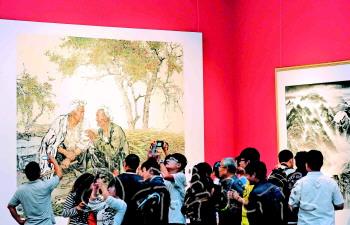 | 12日,十艺节全国优秀美术作品展览在山东美术馆开幕。 本报记者 邱志强 摄 |  | 人们正在参观全国优秀美术作品展。 本报记者 邱志强 摄 |