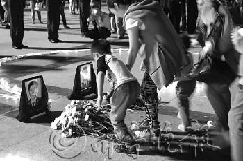 | 13日,说起救火牺牲的儿子,刘洪坤的父亲抽泣不止。 |  | 13日晚,在刘洪坤的老家山东滕州,市民自发献上菊花,悼念英雄。 本报记者 甘倩茹 摄 |